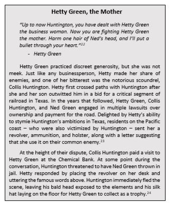 14. Gordon, John Steele. “The Ordeal of Mrs. Hetty Green.” ABA Banking Journal. (November 1, 2019).