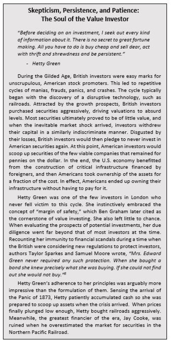 However, contrary to conventional wisdom, Graham was not the first American to apply the principles of value investing. Before Graham was even born, a woman by the name of Hetty Green used these principles to tame the wild markets of the Gilded Age and establish herself as the richest woman in America. Further, Green developed these principles instinctively at an early age, enabling her to thrive during several market panics that ruined many of her male contemporaries. In contrast, Graham embraced value investing only after narrowly avoiding financial ruin after levering his portfolio prior to the Great Crash of 1929.
