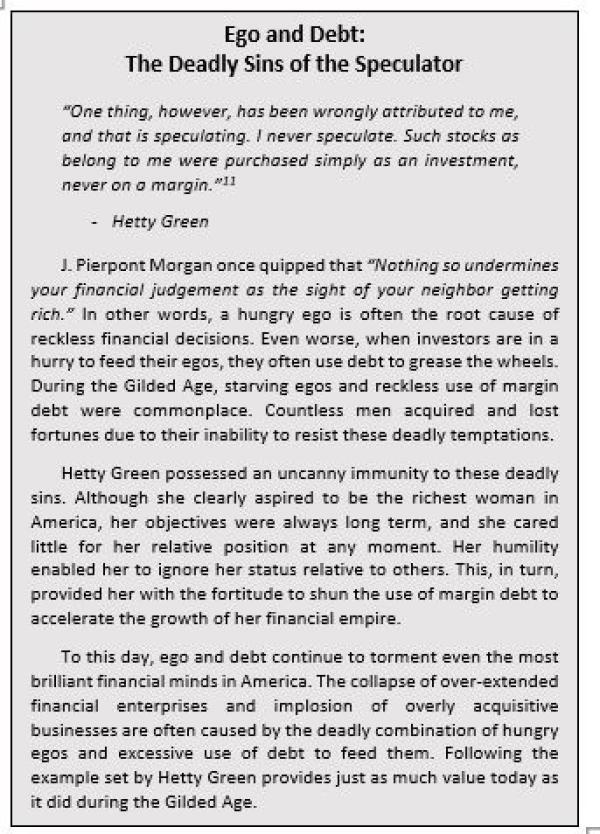 Hetty Green was arguably the most talented investor ever to brave the unforgiving securities markets of Wall Street, yet she received little credit both during and after her life. She was the true pioneer of the value investing philosophy, which Ben Graham only rediscovered and documented nearly 20 years after Hetty’s passing. Her nerves were tested in the Panics of 1873, 1884, 1893, and 1907. Not only did she pass each test with hardly a flinch, but she profited from each crisis, while many men forfeited their fortunes (and occasionally their lives). She refused to cheat investors by using market manipulation and insider trading tactics, which were the preferred weapons of men such as Jay Gould, Daniel Drew, and Collis Huntington. She never yielded to the temptation to boost her returns by using margin debt, thereby avoiding the catastrophes experienced by most speculators – including her own husband. She never allowed the confidence obtained from past conquests to distort her perceptions regarding the strength of future investment prospects. Finally, her modesty preserved her respect for the dignity of all human beings regardless of the size of their bank accounts. This virtue, in particular, made her a cherished mentor to her children, caretaker to her neighbors, Good Samaritan to strangers, and generous lender of last resort to her country.