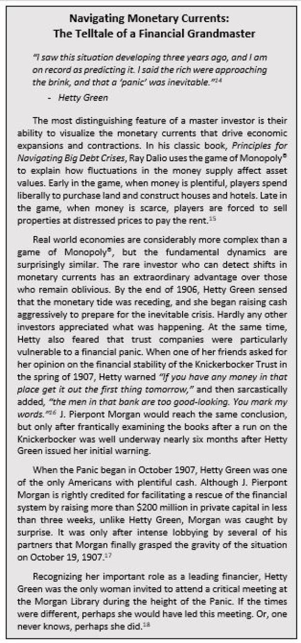 Hetty Green was well-positioned to provide emergency loans because she foresaw the arrival of the Panic of 1907 well in advance. She could do this because she understood the dynamics of monetary flows in a way that few, if any, investors appreciated at the time. This knowledge derived from several decades of experience serving as the lender of last resort to investors, businesses, and governments. Hetty Green’s ability to navigate the expansion and contraction of the money supply sets her apart from almost all investors. Even today, few investors possess such abilities.