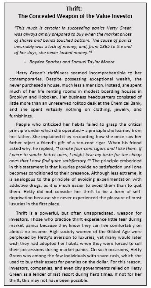 In fairness, this paper does not seek to diminish Graham’s contributions to the investment profession. He deserves credit for documenting multiple value investing techniques that have guided the decisions of many of America’s most successful investors. However, it does seek to properly position Graham’s achievements within a more comprehensive timeline. The truth is that few, if any, of Graham’s principles were unfamiliar to Hetty Green – and, perhaps more importantly, she achieved a level of proficiency that Graham himself would never claim. At the peak of her career, Hetty Green was considered the most creditworthy lender to many of America’s most respected stock operators, corporations, and even the government of New York City. This enabled her to play a crucial role in rescuing the nation during the Panic of 1907, which was a crisis that she predicted well before her peers — even the legendary J. Pierpont Morgan.